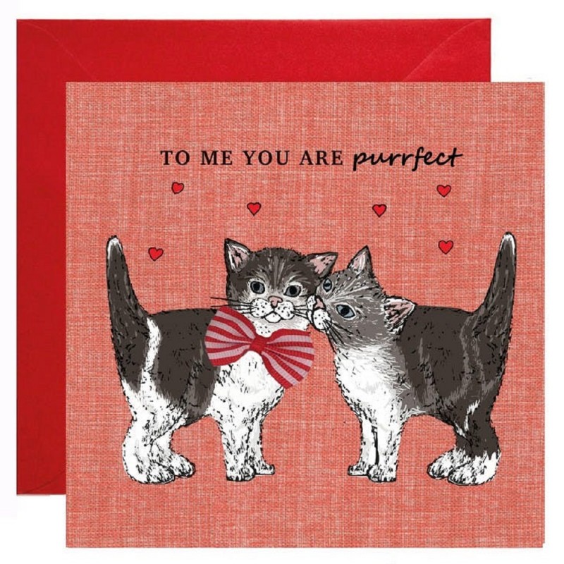 Die Valentinskarte mit den beiden süßen Katzen ist eine originelle und ganz besondere Ergänzung zu einem Valentinstags-Geschenk für KatzenbesitzerInnen und Katzenfans. Über diese Valentinskarte freuen sich aber auch andere weniger katzenafine Damen, weil der Spruch "To me you are purrfect" einfach auch herrlich ist.