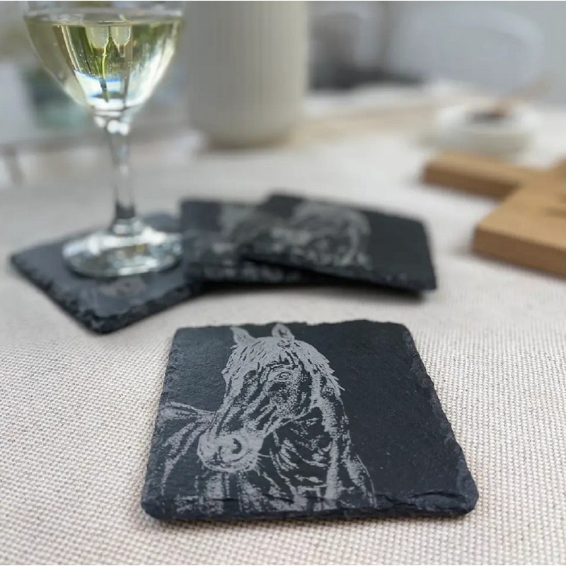 Die Pferde Glasuntersetzer passen perfekt zu unserem Schiefer Tischläufer mit Pferdemotiv sowie zu den Schiefer Pferde Tischsets aus unserem Shop. Sie sehen aber auch elegant zu einem unserer Pferde Holzbretter aus.