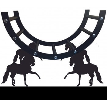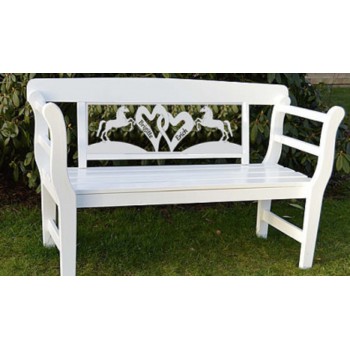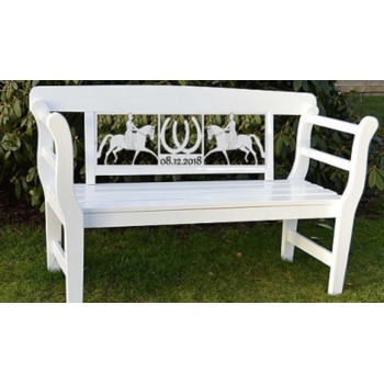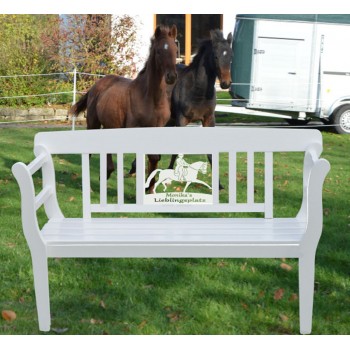 Die Bank mit einer Auswahl an Pferdemotiven: Springen, Dressur, Fahren, Polo, steigendes Pferd oder Stute mit Fohlen.