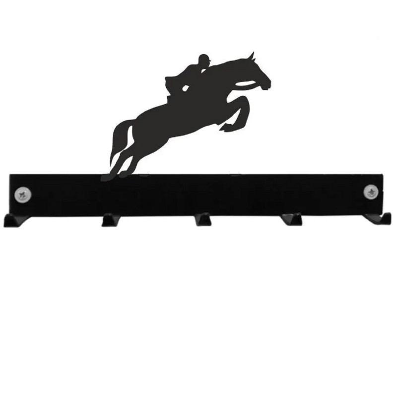 Stylische Pferde Hakenleiste mit Springpferd / SpringreiterIn, die sich gleichermaßen als Pferde Schlüsselhaken, als kleine Pferde Garderobenleiste / Pferde Kleiderhaken oder als Pferde Handtuchhaken in Küche und Bad eignen. Auch als Hakenleiste für Hundeleinen und Halsbänder sind die Pferde Wandhaken toll