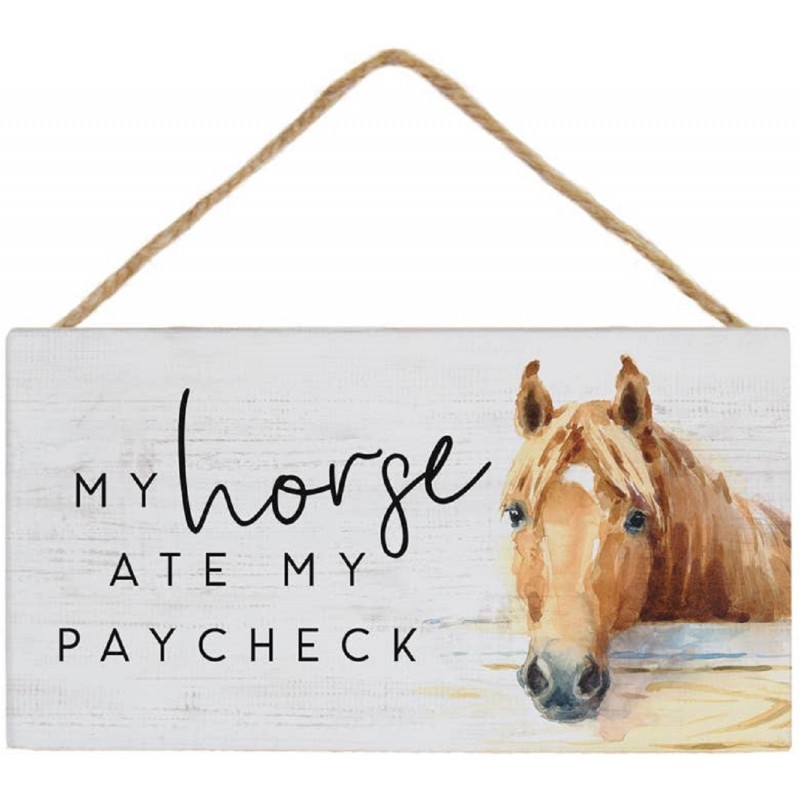 Das Schild mit dem witzigen Pferde/Reiterspruch ist ein nettes Mitbringsel für Pferdebesitzer:innen.
