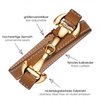 Das Trensen-Armband besteht aus vollnarbigem, naturgeschrumpften Kalbsleder und ist doppelt gewickelt. Es sind 35 Arbeitsgänge erforderlich, um ein Armband in dieser Qualität herzustellen. Eine Ziernaht schmückt die hochwertige Lederoberfläche. Das Unterleder aus deutschen Manufakturen verleiht ein traumhaftes Tragegefühl.