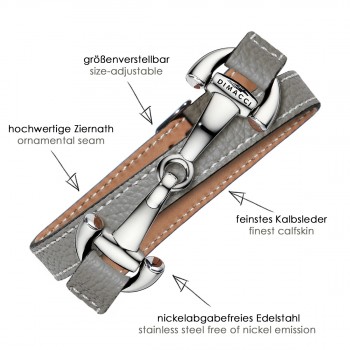 Das Trensen-Armband wird hergestellt aus vollnarbigem, naturgeschrumpften Kalbsleder und ist doppelt gewickelt. Es sind 35 Arbeitsgänge erforderlich, um ein Armband in dieser Qualität herzustellen. Eine Ziernaht schmückt die hochwertige Lederoberfläche. Das Unterleder aus deutschen Manufakturen verleiht ein traumhaftes Tragegefühl.