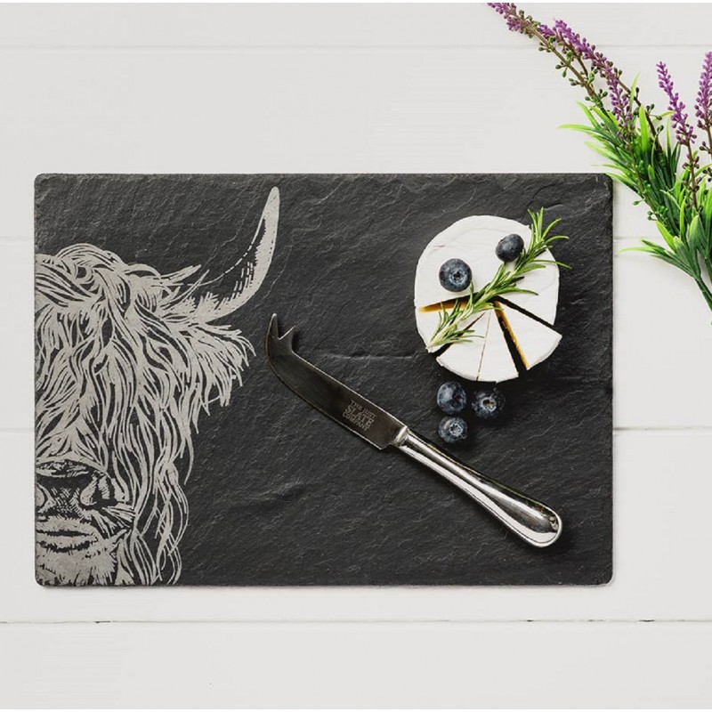 Großzügig dimensionierte Käseplatte / Aufschnittplatte / Servierplatte aus Schiefer mit zotteligem Highland Rind