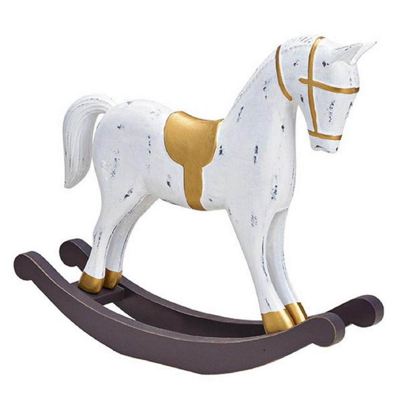 Weißes Holzschaukelpferd, veredelt mit goldenem Sattel und Zaumzeug